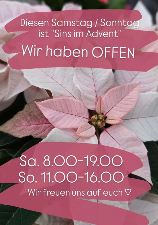 Blumengeschäft im Cherne: Stilvolle Adventsfloristik für eine besinnliche Adventszeit und liebevoll gearbeitete Geschenk-Ideen werden von unserem Floristen-Team präsentiert. Lassen sie sich inspirieren und beraten, und geniessen sie die lichtvolle vorweihnächtliche Stimmung. Wir sind Sins im Advent mit dabei.